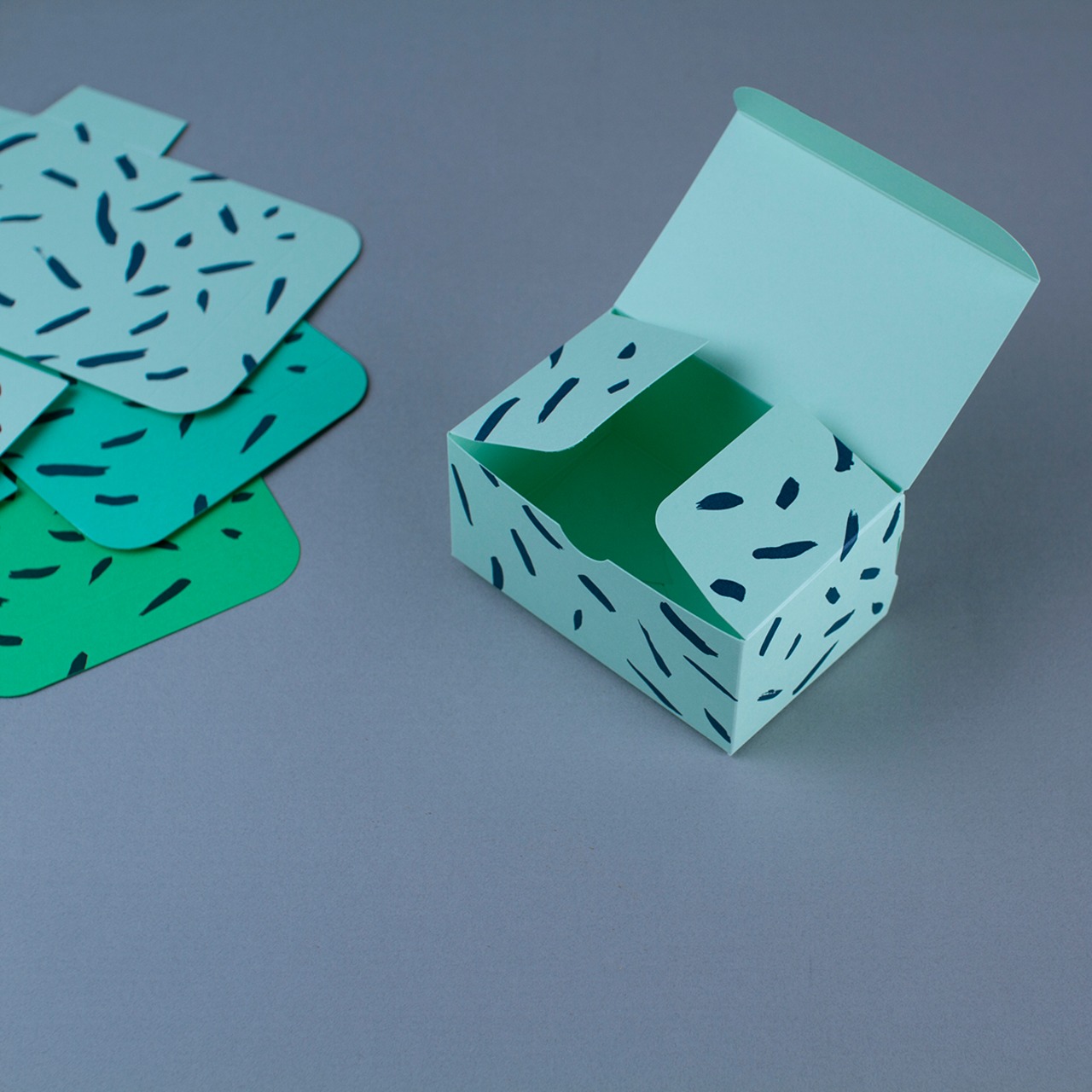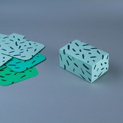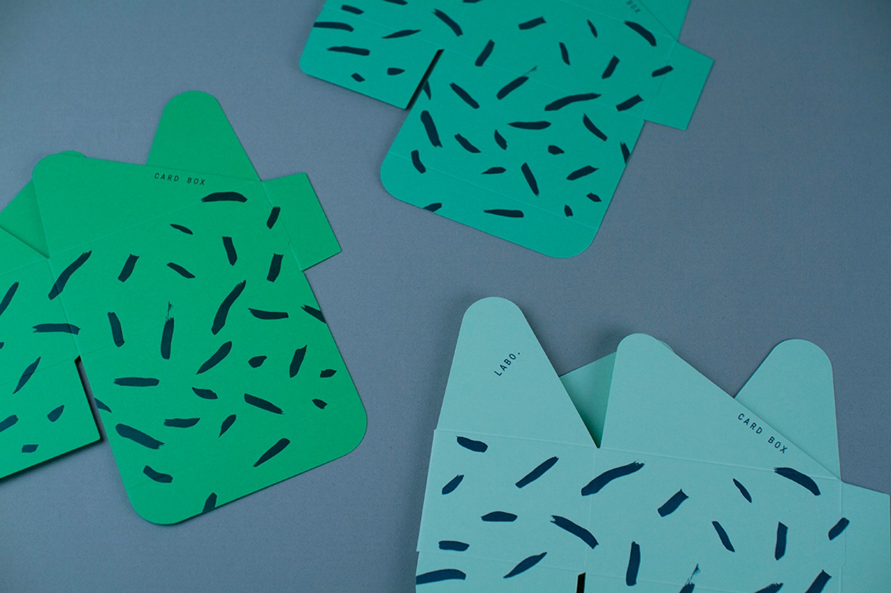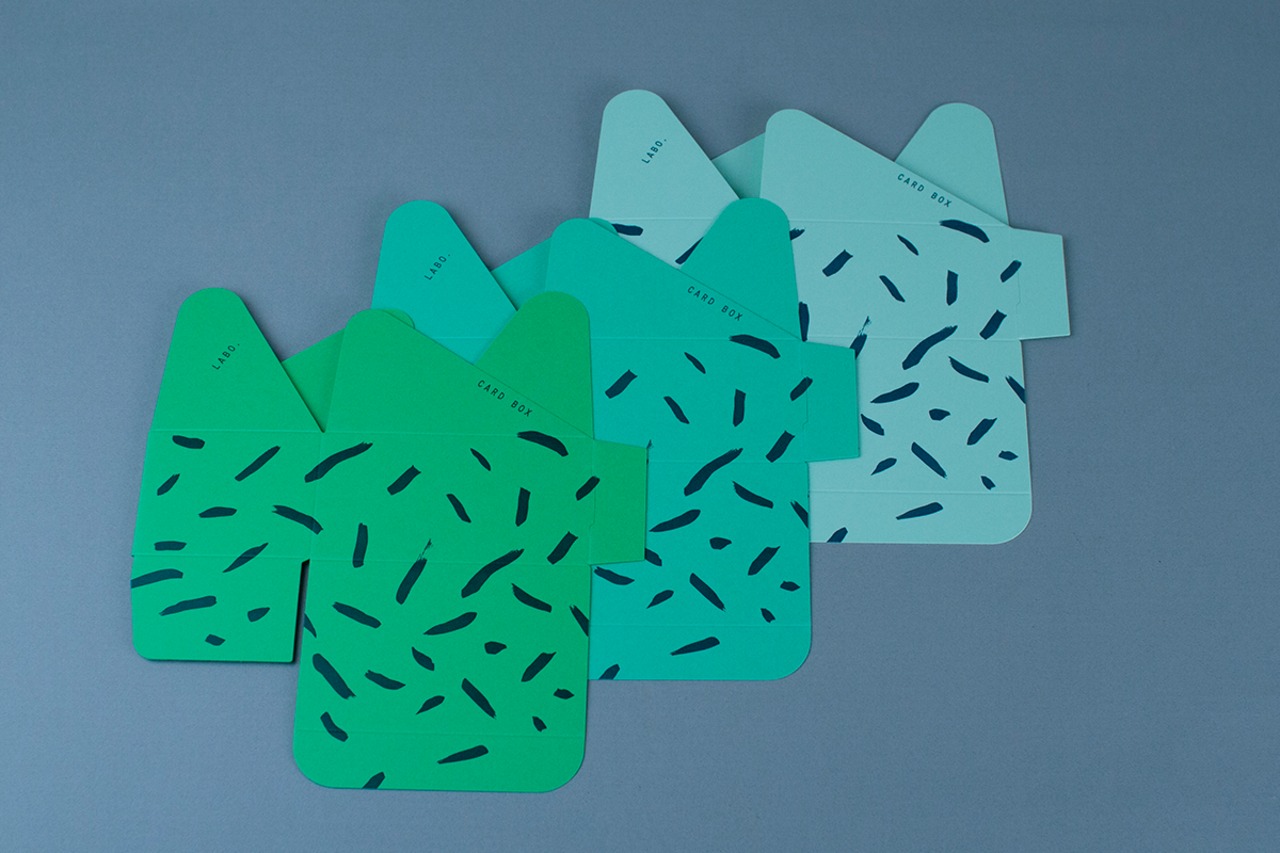 リニューアルした組み立て式のオリジナル名刺箱。ハリと強度のある紙に変えて3種のグリーンを選び、柄を鉄紺で印刷しました。今ではめずらしい地獄底という組み方を採用しています。名刺を作らせてもらう機会が多いから、名刺をしまう箱のこともどうしても気になる性分です。